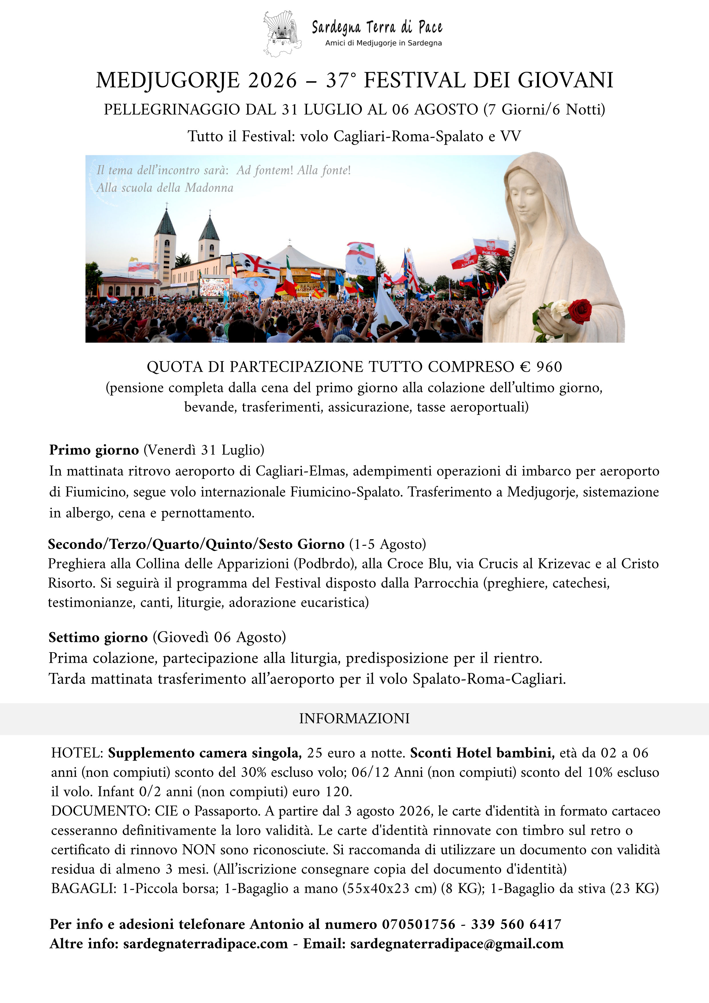 “Cari figli, Prego per voi e vi esorto ad una vita nuova, vita nella gioia e nella preghiera. Figlioli, lo Spirito Santo vi colmi di gioia affinché siate come una fonte d’acqua pura e potabile, affinché, figlioli, siate in Dio e con Dio missionari di carità e di pace. La vostra vita, qui sulla Terra, è breve e per questo sono con voi per guidarvi verso il Cielo. Grazie per aver risposto alla mia chiamata.”