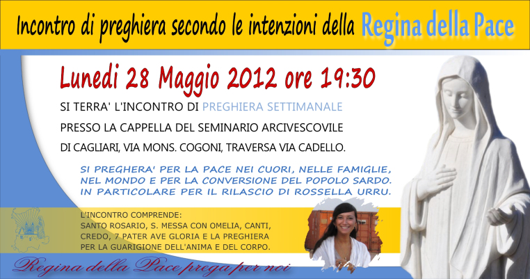 Incontro di preghiera settimanale del gruppo Amici di Medjugorje in Sardegna Lunedì 28 Maggio 2012 14 lunedì Gen 2013 Dimensione originale su 762 × 401 ≈ Lascia un commento Locandina Incontro di Preghiera Settimanale del 28 Maggio 2012