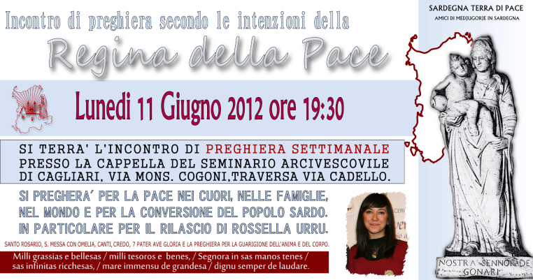 Incontro di preghiera settimanale del gruppo Amici di Medjugorje in Sardegna Lunedì 11 Giugno 2012 14 lunedì Gen 2013 Dimensione originale su 762 × 401 ≈ Lascia un commento Locandina Incontro di Preghiera Settimanale del 11 Giugno 2012