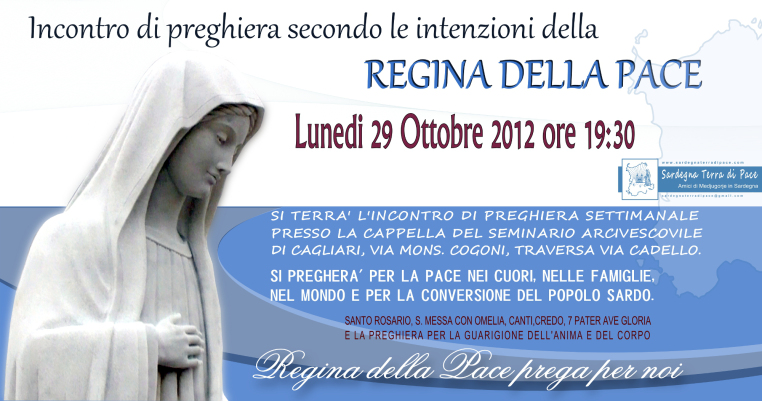 Incontro di preghiera settimanale del gruppo Amici di Medjugorje in Sardegna il 29 Ottobre 2012 14 lunedì Gen 2013 Dimensione originale su 762 × 401 ≈ Lascia un commento Locandina Incontro di Preghiera Settimanale del 29 Ottobre 2012