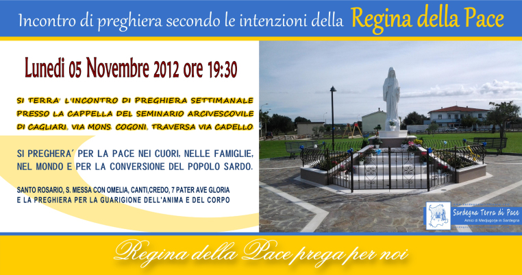 Incontro di preghiera settimanale del gruppo Amici di Medjugorje in Sardegna il 5 Novembre 2012 14 lunedì Gen 2013 Dimensione originale su 762 × 401 ≈ Lascia un commento Locandina Incontro di Preghiera Settimanale del 5 Novembre 2012