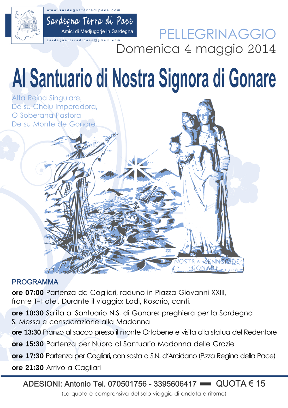 Programma pellegrinaggio Santuario Gonare 2014 25 venerdì Apr 2014 Dimensione originale su 1000 × 1414 ≈ Lascia un commento Locandina Pellegrinaggio N. S. di Gonare 2014 – Foto di Sardegna Terra di Pace – Tutti i diritti riservati