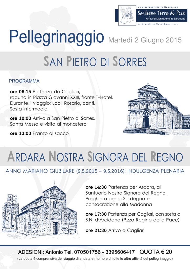Pellegrinaggio a San Pietro di Sorres e Ardara 2015 21 giovedì Mag 2015 Dimensione originale su 990 × 1400 ≈ Lascia un commento Locandina Pellegrinaggio in Sardegna 2015 – Foto di Sardegna Terra di Pace – Tutti i diritti riservati