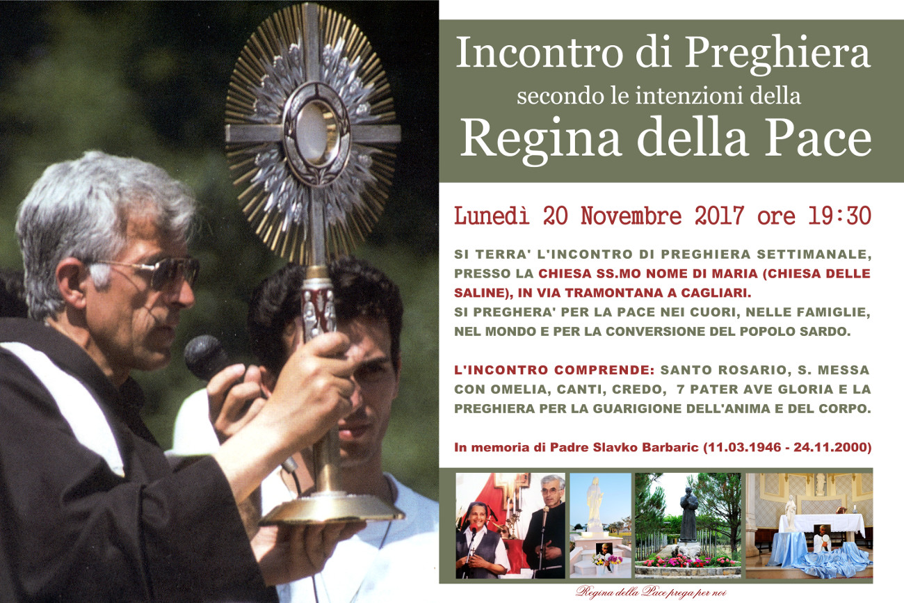 Incontro di Preghiera del gruppo Amici di Medjugorje in Sardegna Lunedì 20 Novembre 2017 alla memoria di Padre Slavko Barbaric 16 giovedì Nov 2017 Dimensione originale su 1300 × 867 ≈ Lascia un commento Locandina Incontro di Preghiera Settimanale del 20 novembre 2017