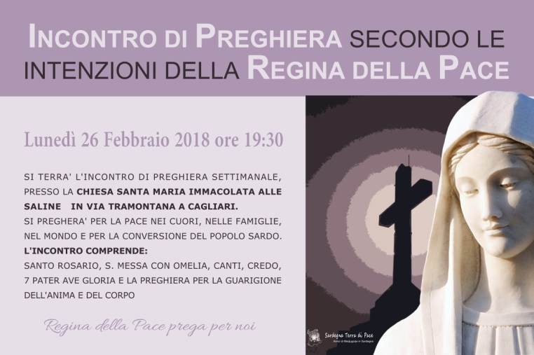 Incontro di Preghiera del gruppo Amici di Medjugorje in Sardegna Lunedì 26 Febbraio 2018 24 sabato Feb 2018 Dimensione originale su 1200 × 800 ≈ Lascia un commento Locandina Incontro di Preghiera Settimanale del 26 Febbraio 2018