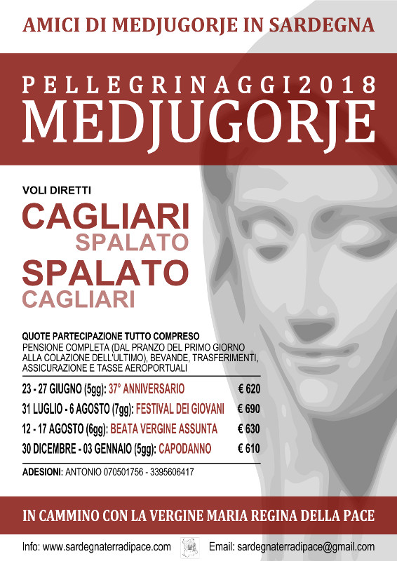 Il gruppo Amici di Medjugorje in Sardegna, che fin dai primi anni (1983), ha accompagnato migliaia di fedeli a Medjugorje, a 35 anni dal primo pellegrinaggio dalla Sardegna, in questo 37esimo anno delle apparizioni, propone il nuovo programma di viaggio.