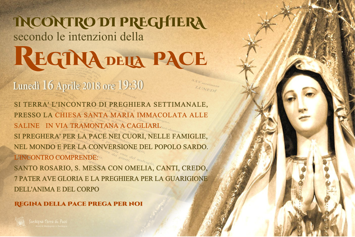 Incontro di Preghiera del gruppo Amici di Medjugorje in Sardegna Lunedì 16 Aprile 2018 14 sabato Apr 2018 Dimensione originale su 1200 × 800 ≈ Lascia un commento Locandina Incontro di Preghiera Settimanale del 16 Aprile 2018