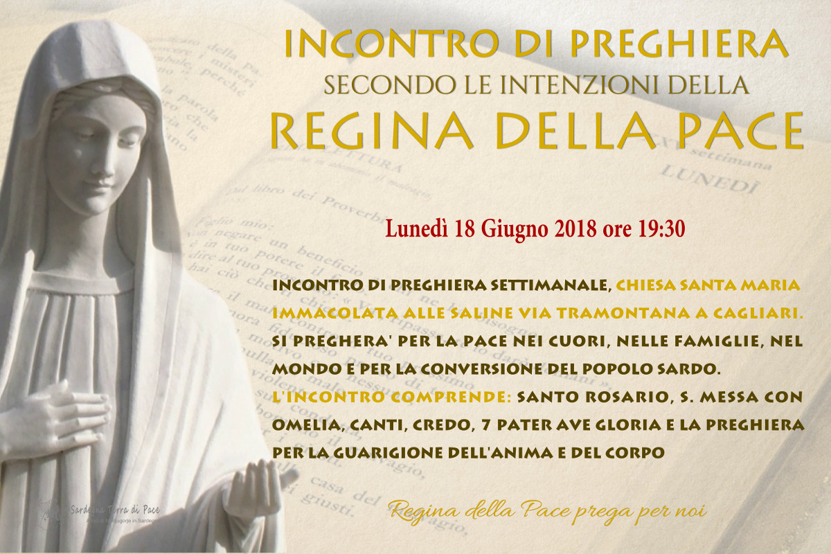 Incontro di Preghiera del gruppo Amici di Medjugorje in Sardegna Lunedì 18 Giugno 2018 15 venerdì Giu 2018 Dimensione originale su 1200 × 800 ≈ Lascia un commento Locandina Incontro di Preghiera Settimanale del 18 Giugno 2018