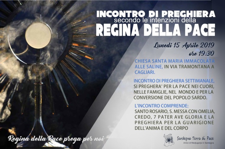 Incontro di Preghiera del gruppo Amici di Medjugorje in Sardegna Lunedì 15 Aprile 2019 11 giovedì Apr 2019 Dimensione originale su 1200 × 800 ≈ Lascia un commento Locandina Incontro di Preghiera Settimanale del 15 Aprile 2019