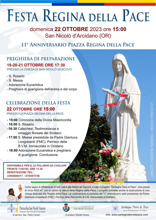 Domenica 22 Ottobre 2023, Giornata Missionaria Mondiale, alle ore 15:00, a San Nicolò d’Arcidano (OR), si celebrerà il 11° anniversario della Inaugurazione della piazza e della statua dedicata alla “Regina della Pace”, come segno di risposta alla chiamata e di rinnovato affidamento di tutti i sardi alla Madre del Signore.